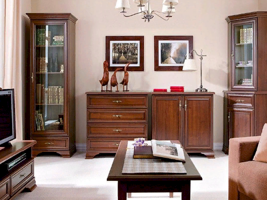 Кентаки - мебель классического стиля, отличающаяся природными цветами, отделкой, фактурой, всегда актуальна и востребована, она настолько универсальна, что без проблем впишется в любой современный дизайн. Стиль набора модульной мебели подчеркивается лакированной патинированной планкой в фасадах, карнизами - завершающим акцентом в зеркалах и высоких элементах набора, витиеватыми ручками.