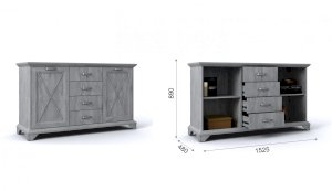 Наполнение: 4 выдвижных ящика + 2 шкафчика с распашными дверцами (внутри по 1 полке)