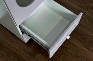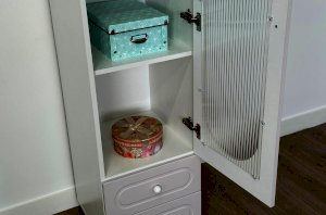 Модель оснащена одной распашной дверцей с вставкой из прозрачного рифлёного стекла, а также двумя вместительными выкатными ящиками в нижней части для хранения одежды, текстиля или аксессуаров. Внутреннее наполнение можно выбрать в зависимости от задач: шкаф комплектуется полками или штангой для плечиков, что позволяет адаптировать его под разные потребности.