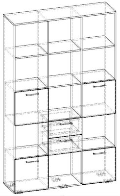 Применение задней стенки из ЛДСП (в ячейках с ящиками и фасадами) позволяет использовать данный стеллаж для зонирования пространства (чтобы предотвратить опрокидывание, необходимо обеспечить крепление стеллажа к стене).