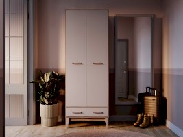 Двухстворчатый шкаф «Скандика» выполнен из качественной ЛДСП в оттенках дуб смоки/кашемир. Матовые фасады практичны в использовании. Модель состоит из нижнего выкатного ящика, двух распашных дверок, за которыми находится отделения с хромированной штангой, вместительная верхняя полка и встроенный блок с двумя дополнительными полками. Створки плотно фиксируются на магнитах.