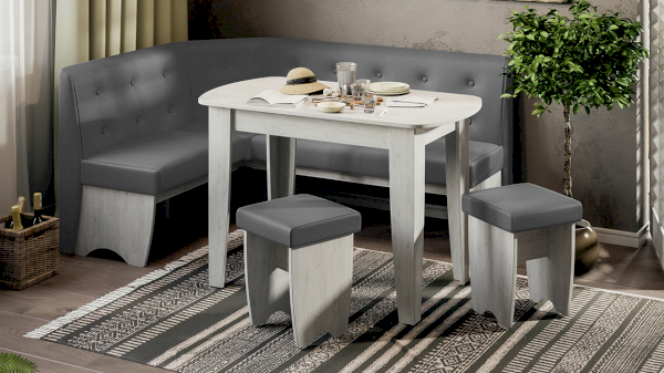Декоративные накладки, установленные по бокам скамьи, и пуговки на спинке, подчеркивают элегантный дизайн этой обеденной группы, которая, несомненно, станет изюминкой в любой кухне. Разнообразие актуальных цветовых исполнений позволяет приобрести модель исходя из индивидуальных предпочтений каждого потребителя, подобрав мебель на любой вкус и цвет.