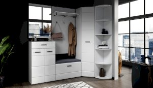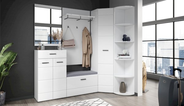 Угловой шкаф выполнен в современном стиле – сочетает в себе функциональность и эффектный внешний вид: строгая горизонтальная фрезеровка фасадов, ручки и задняя стенки контрастного черного цвета. Глянцевые белые фасады High Gloss из МДФ наполняют комнату светом, делают ее просторнее. Внутри предусмотрены секции для белья и отделение со штангой. Шкаф позволяет рационально использовать пространство и будет хорошо смотреться даже в небольшой комнате, служит связующим звеном для составления угловой системы хранения. Идеально компонуется со всеми модулями системы Йорк.