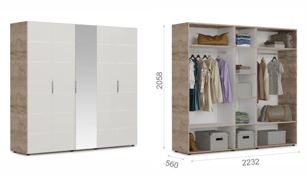 Современный распашной шкаф Джулия яркий представитель европейского минимализма. Это шкаф-конструктор, который позволяет выбрать подходящий вам размер, его наполнение и дизайн. На базе корпуса можно создать множество комбинаций: с зеркалами, с глухими глянцевыми фасадами, с порталом из ЛДСП 22мм или без него. Дополнительная опция – светодиодная подсветка монтируется в верхней части портала над каждой дверью. Шкаф выполнен из экологически безопасных надежных материалов. Декором белым глянцевым фасадам High Gloss служит фрезерованный рисунок «Волна» - подчеркивает зеркальный блеск, делает интерьер спальни особенным и неповторимым. Торцевые ручки из хромированного металла - яркий акцент фасадов. Наполнение шкафа включает в себя вместительные полки и отделения со штангой, что позволяет создать систему для хранения вещей различного назначения. Идеально компонуются со всеми модулями системы Джулия.